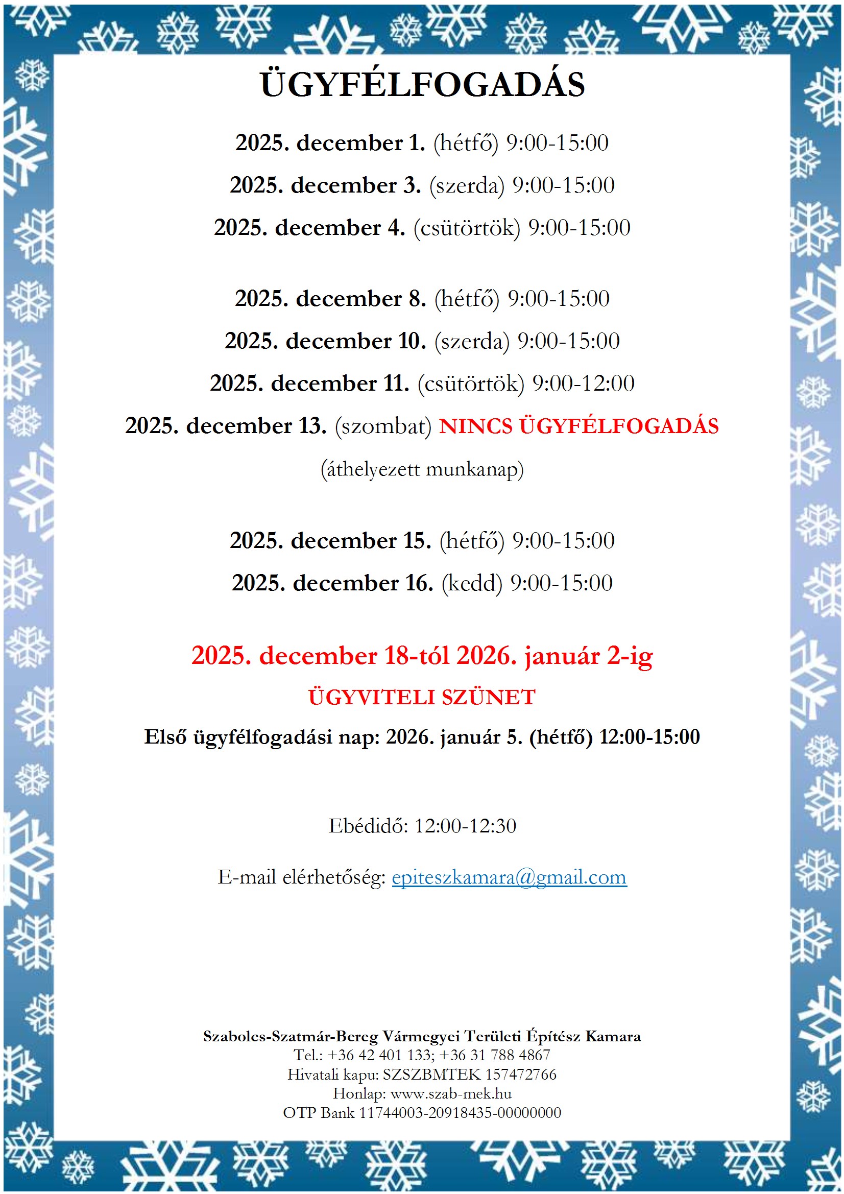 Ügyfélfogadás 2025. decemberi ügyfélfogadás csilla küldte be 28 November 2025 időpontban Ügyfélfogadás Kapcsolódó bejegyzéek 2025. november 28. ÜGYVITELI SZÜNET 2025. december 18. (csütörtök) és 2025. január 2. (péntek) között 2025. november 03. 2025. novemberi ügyfélfogadás 2025. október 01. 2025. október ügyfélfogadás 2025. augusztus 29. 2025. szeptember ügyfélfogadás 2025. június 27. 2025. augusztus ügyfélfogadás 2025. június 12. 2025. június hónap ügyfélfogadás