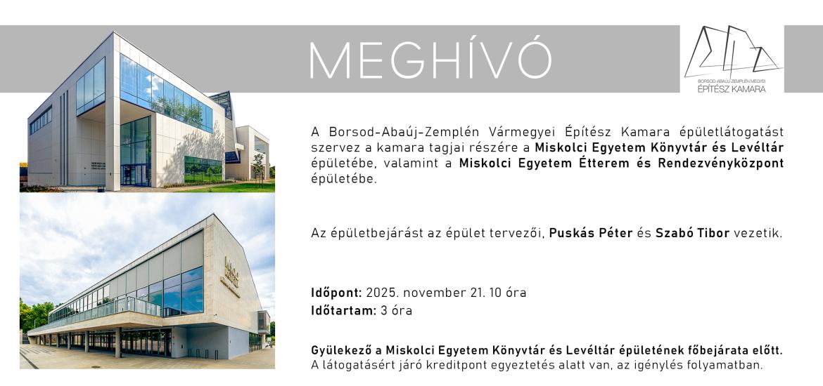 Mellékelten küldöm a 2025. november 21-i Miskolci Egyetem épületbejárására szóló meghívót.