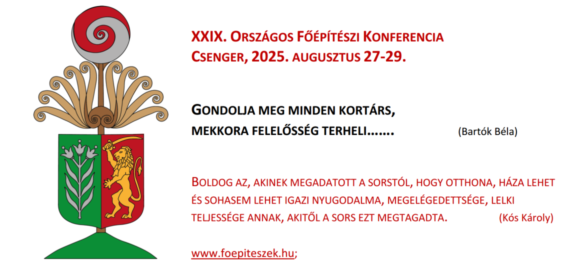 Rendezvények ORSZÁGOS FŐÉPÍTÉSZI KONFERENCIA 2025 - CSENGER csilla küldte be 23 April 2025 időpontban Esemény dátuma 2025-08-27 elso_felhivas_2025.04.23.pdf (271.93 KB) Kapcsolódó bejegyzéek 2025. október 03. 2025. október 6. ǀ 18:00 – Vadásztársaság - Vadász Bence 60 ǀ építészeti kiállítás Szegeden 2025. október 03. 2025. október 9. ǀ 9:00 – Országépítés - Makovecz Imre nyomdokain ǀ konferencia 2025. október 03. ÉMSZ SZAKMAI KLUB 2025 – Hajdúszoboszló - 2025. október 14. 2025. október 03. XXXII. Országos Műemléki Konferencia - 2025. október 16-18. - Budapest-Ják 2025. szeptember 12. Szakmai konferencia meghívó - 2025. október 1-3., Veszprém - Online regisztráció elindult 2025. szeptember 10. Tisztelgés Kertai László építészeti munkássága előtt - megemlékezés az Építészet Világnapja alkalmából - 2025.10.11.